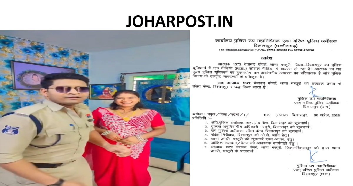 छत्तीसगढ़ बिलासपुर ‘हाय रानी, हल्लो रानी’ …वर्दी की मर्यादा भूले आरक्षक, SSP ने सिखाया कड़ा सबक, इस वीडियो पर आपकी क्या राय है, खुलकर बताइए April 7, 2026 JOHAR POST बिलासपुर। जिले के मस्तुरी थाना में पदस्थ आरक्षक देवानंद कैवर्त्य का एक वीडियो सोशल मीडिया पर तेजी से वायरल हो गया। वीडियो में वह अपनी पत्नी के साथ संबलपुरी गाने…